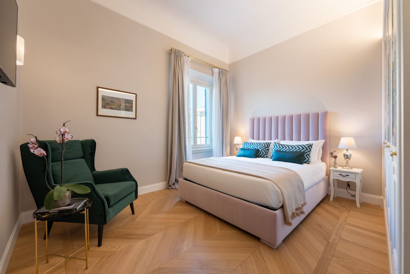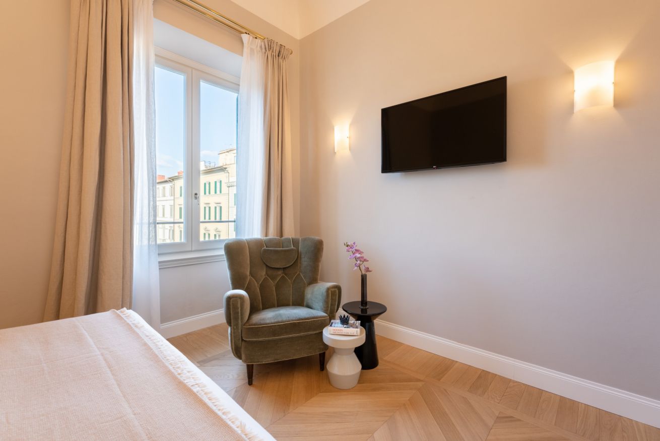 Sempre dall'area giorno si accede alla terza ed ultima camera disposta in modo speculare rispetto alla seconda camera, con affaccio sui palazzi fiorentini ed anch'essa con un raffinato bagno en-suite interamente rivestito di marmo scuro e dalle particolarissime decorazioni a tema esotico anch'esse "in continuum" con le armadiature della camera.