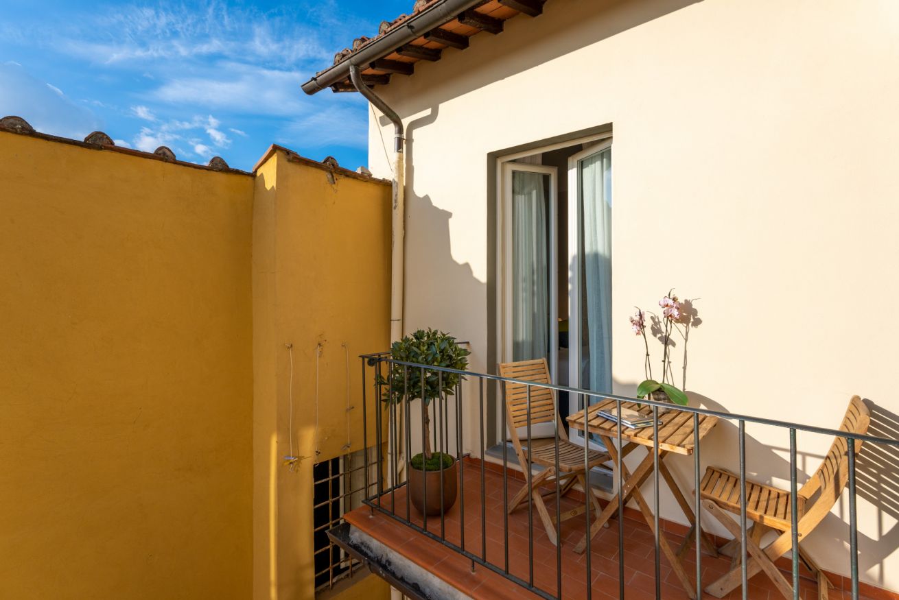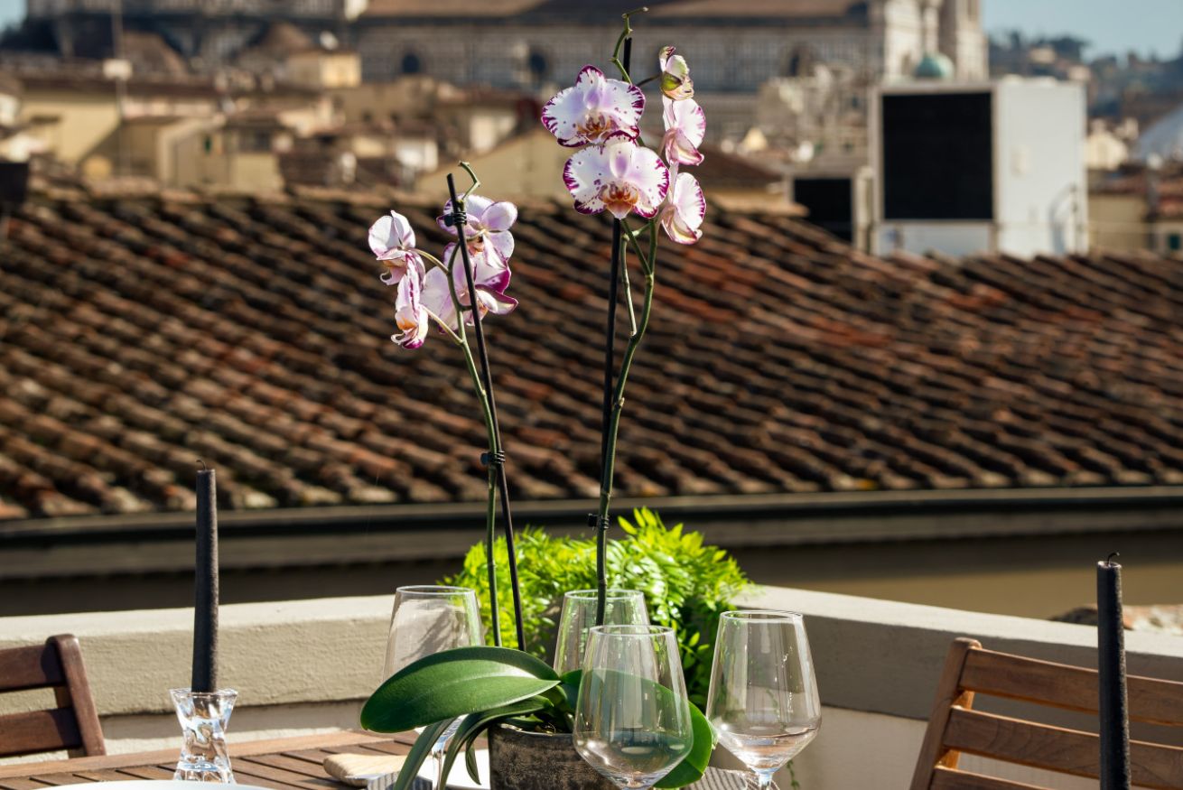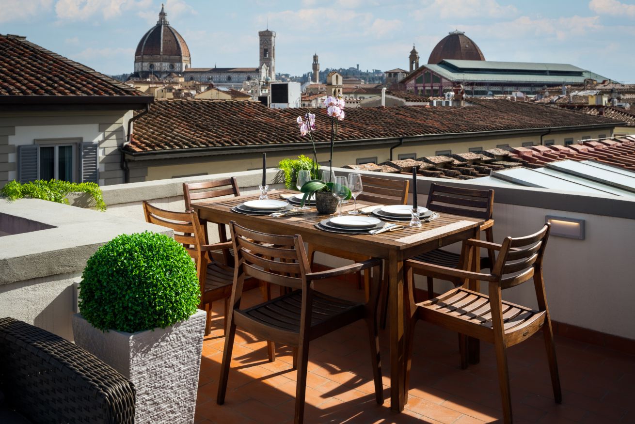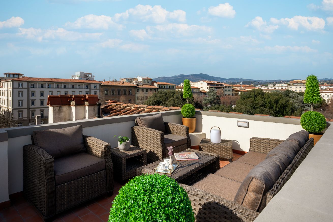 Dall'ingresso, tramite un piccolo montacarichi privato, troverete la caratteristica più sorprendente di questo appartamento - l'incredibile terrazza panoramica a 360 ° con vista su tutta Firenze. Da qui si può godere di un'incredibile vista sui monumenti fiorentini e sulle colline di Fiesole. Inoltre al piano della terrazza è presente un piccolo cucinotto, così da potersi godere un aperitivo sul tavolo e sedie allestite per lo spazio.