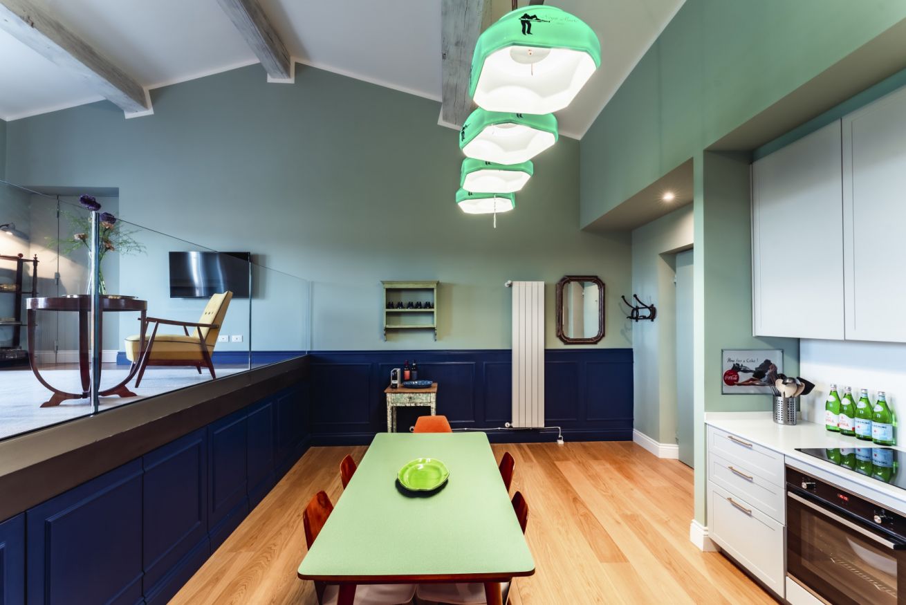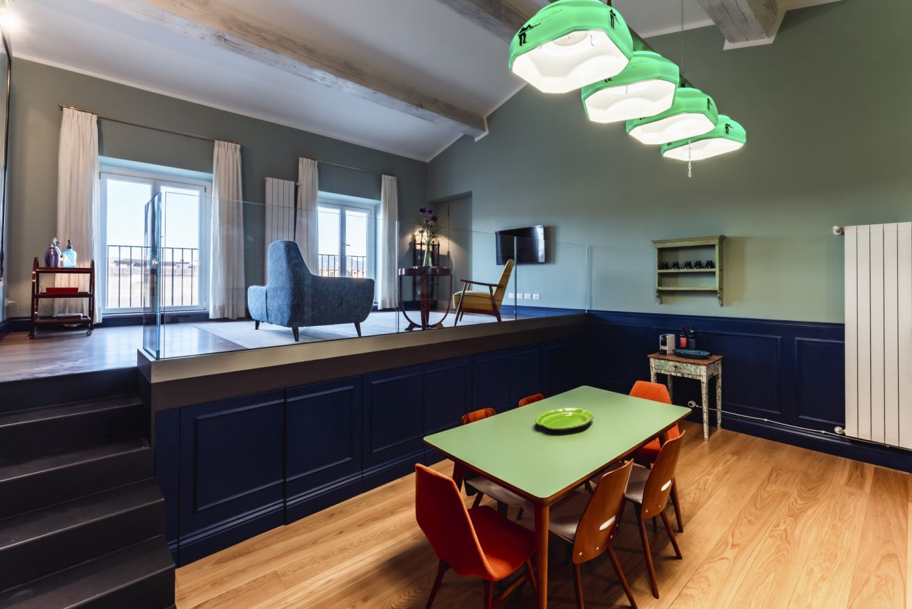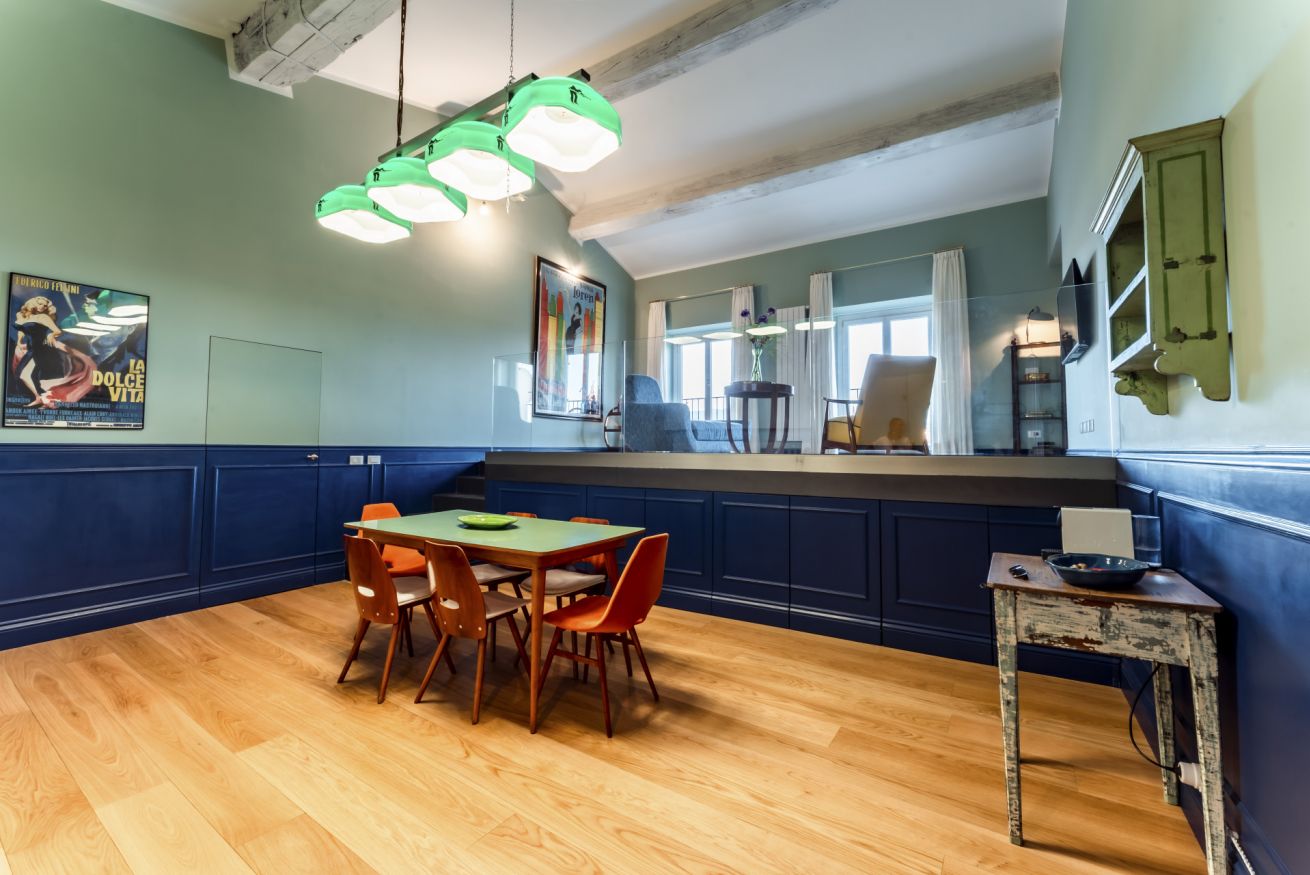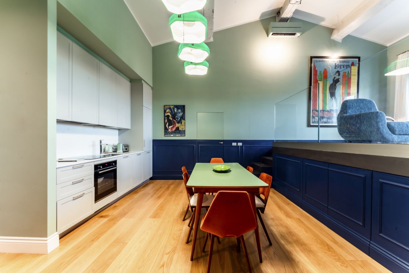 La Dolce Vita si apre in un'unica area giorno che ospita salotto e sala da pranzo. Le 2 aree condividono lo stesso spazio, ma sono nettamente distinte grazie anche ad elementi architettonici che hanno spostato su un piano rialzato il salotto. Arricchita da splendidi arredi di design, questa zona è illuminata da 2 grandi porte finestre che incorniciano uno dei panorami più belli del mondo e che conducono direttamente sul balcone affacciato sull'Arno. La sala da pranzo con cucina totalmente attrezzata, si ispira ad una sala da biliardo con le luci originali sopra il tavolo da pranzo che richiama il panno verde del tavolo da gioco.