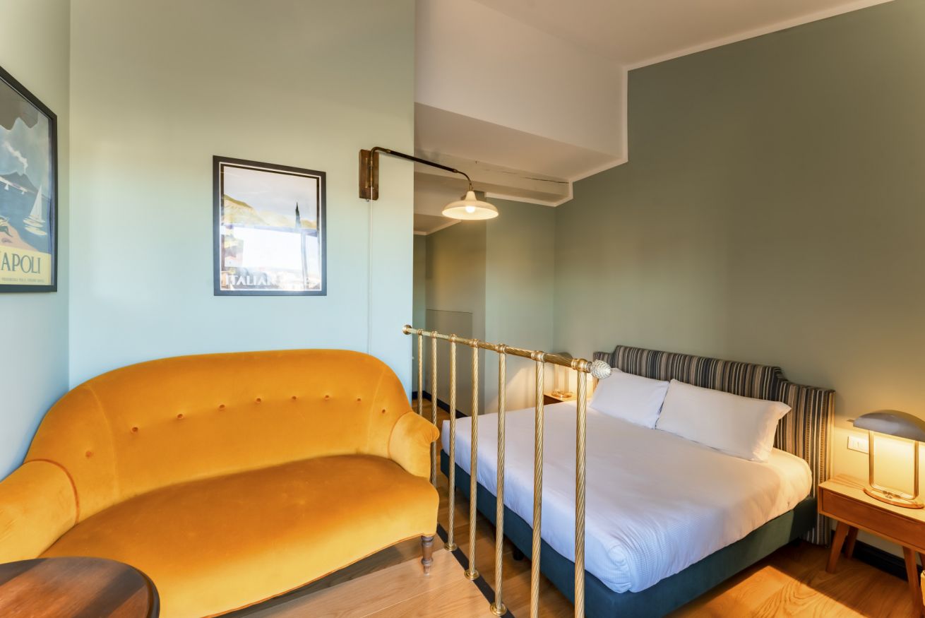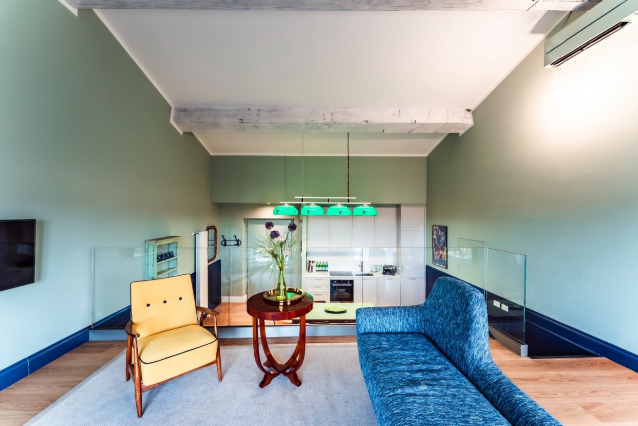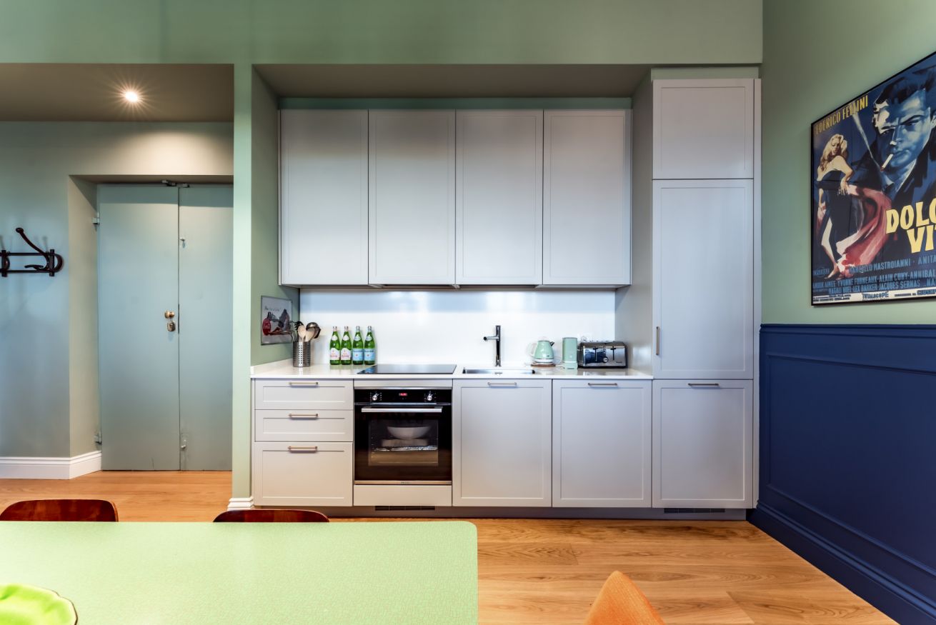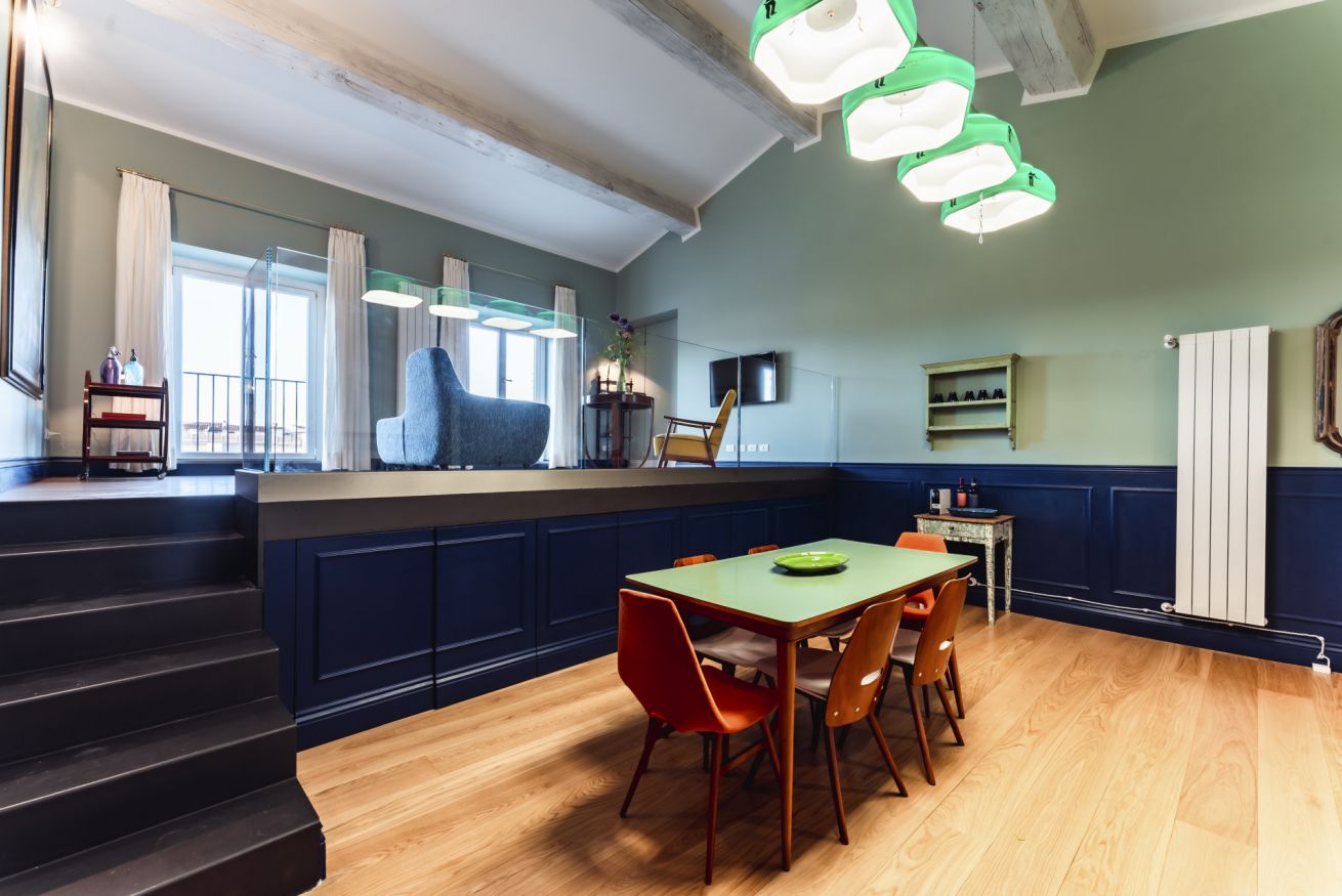 La Dolce Vita si apre in un'unica area giorno che ospita salotto e sala da pranzo. Le 2 aree condividono lo stesso spazio, ma sono nettamente distinte grazie anche ad elementi architettonici che hanno spostato su un piano rialzato il salotto. Arricchita da splendidi arredi di design, questa zona è illuminata da 2 grandi porte finestre che incorniciano uno dei panorami più belli del mondo e che conducono direttamente sul balcone affacciato sull'Arno. La sala da pranzo con cucina totalmente attrezzata, si ispira ad una sala da biliardo con le luci originali sopra il tavolo da pranzo che richiama il panno verde del tavolo da gioco.
