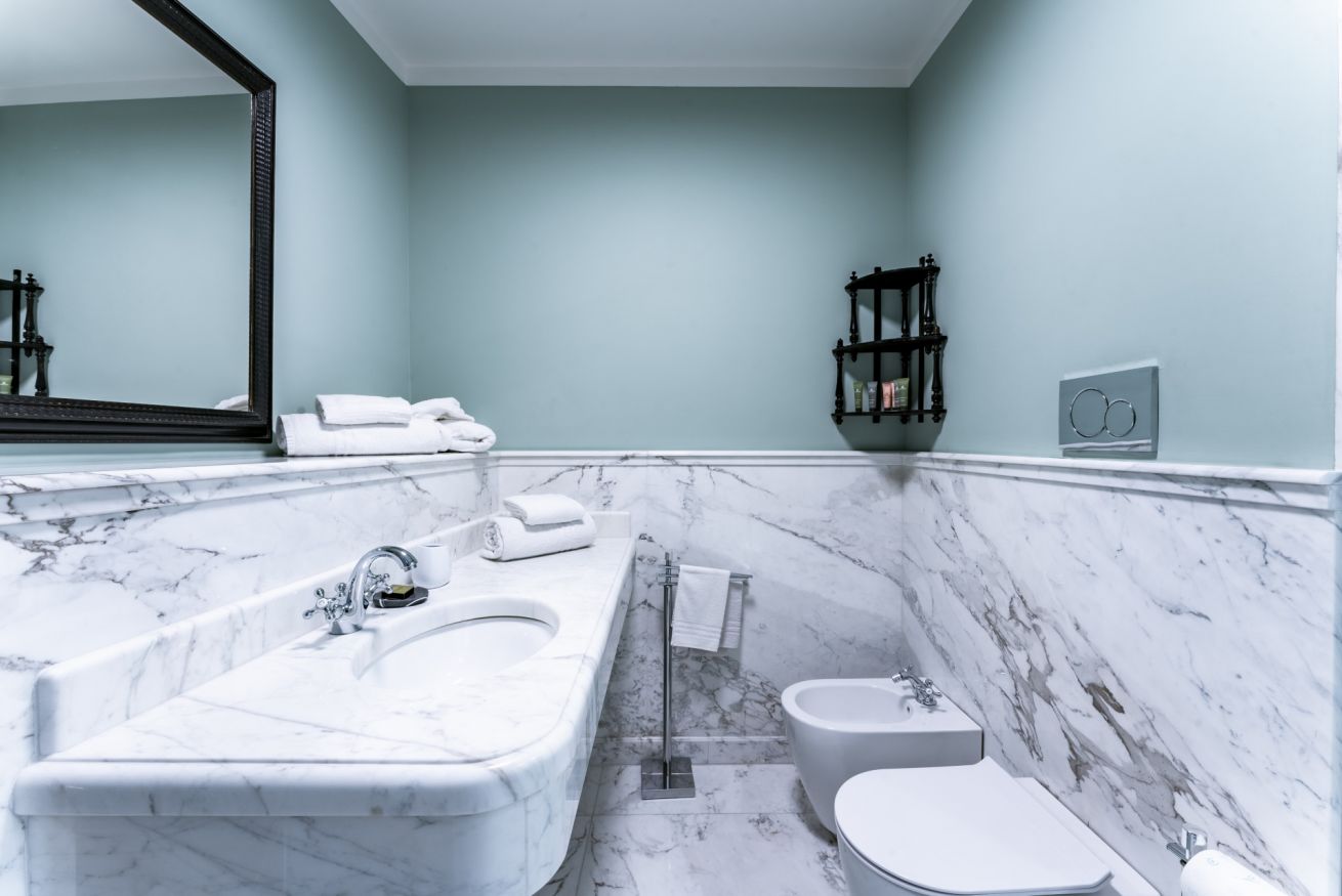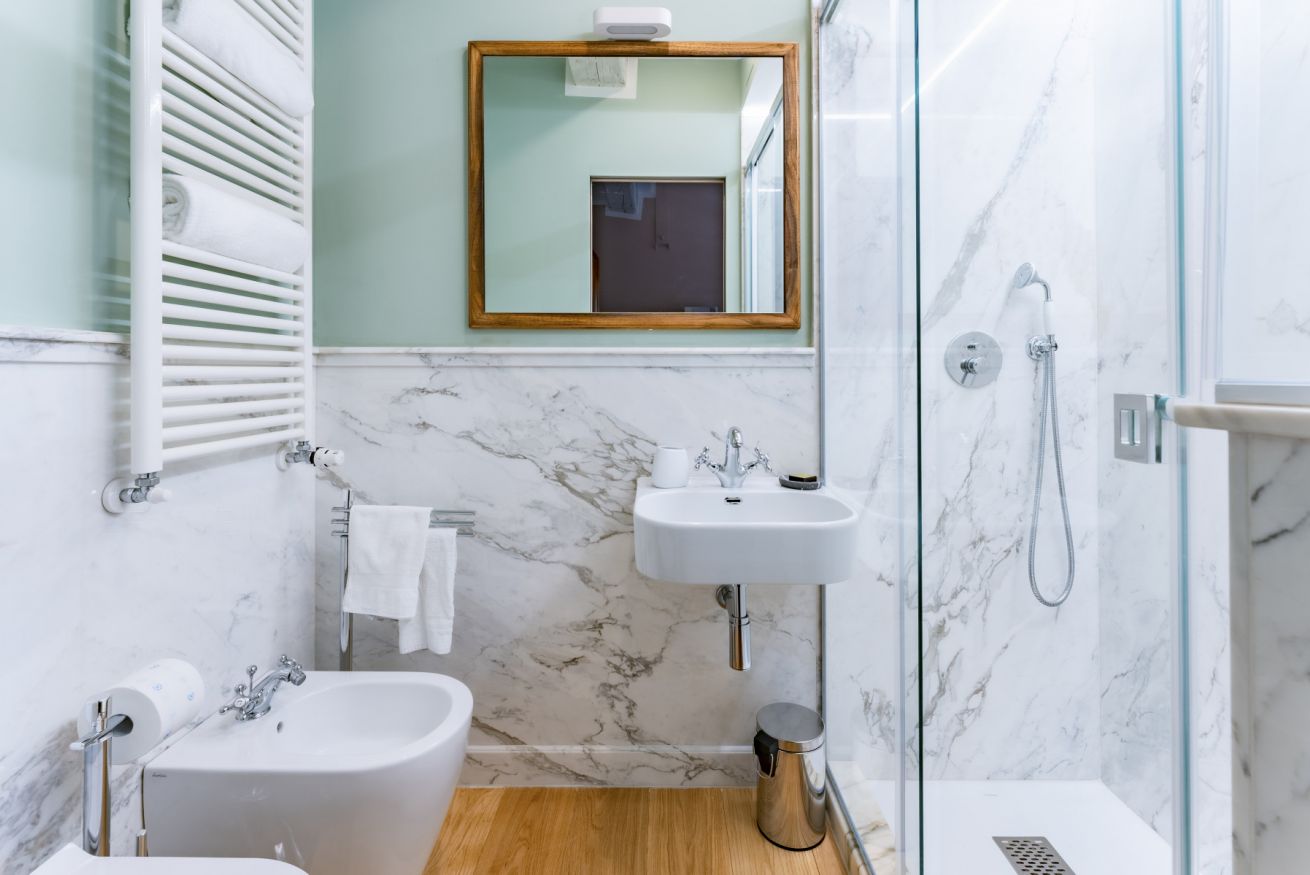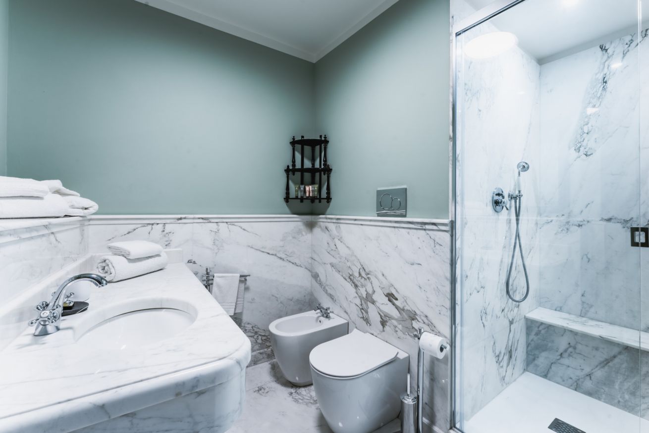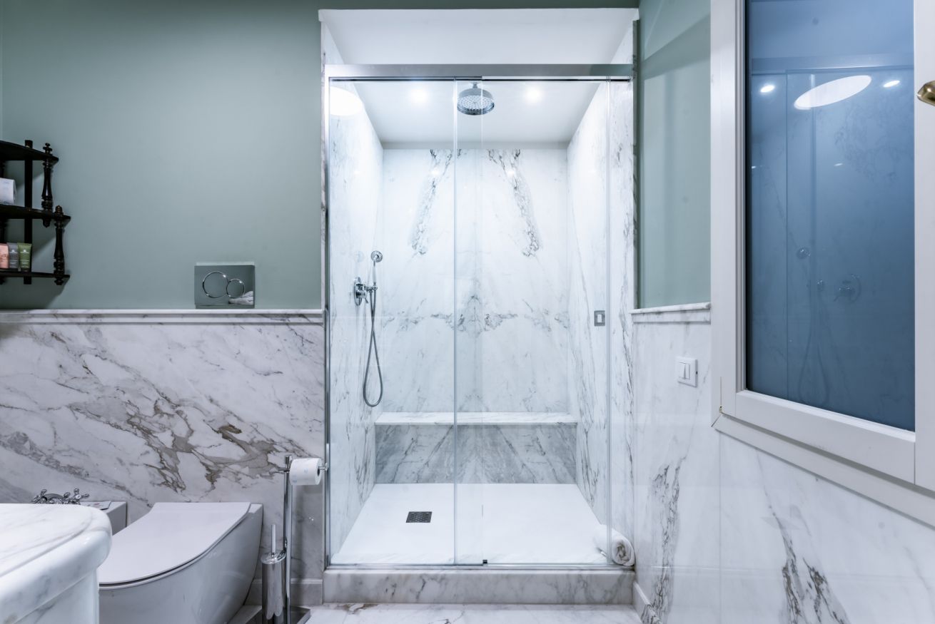 Completa l'appartamento il secondo bagno dalle ricche rifiniture e dotato di ampia doccia.
