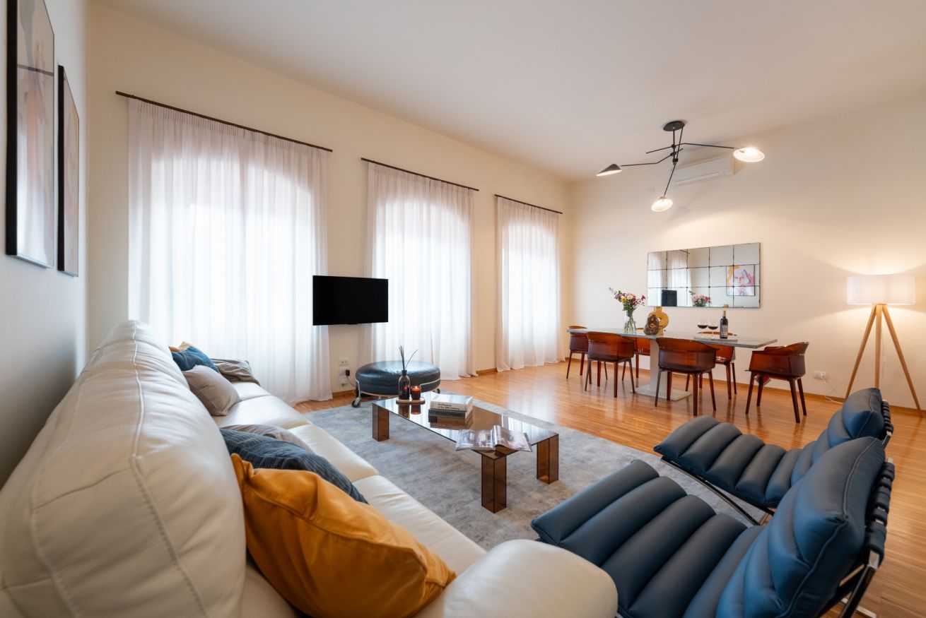 Proseguendo sullo stesso lato del corridoio si accede all' ampia zona giorno che ospita sala da pranzo e salotto dal design squisito e raffinato. Lo spazio è illuminato da ben 3 finestre e rende l'atmosfera ariosa e confortevole. La sala da pranzo si compone di un elegante tavolo con 6 sedute ed il salotto ospita un enorme divano con poltrone e pouf di design.