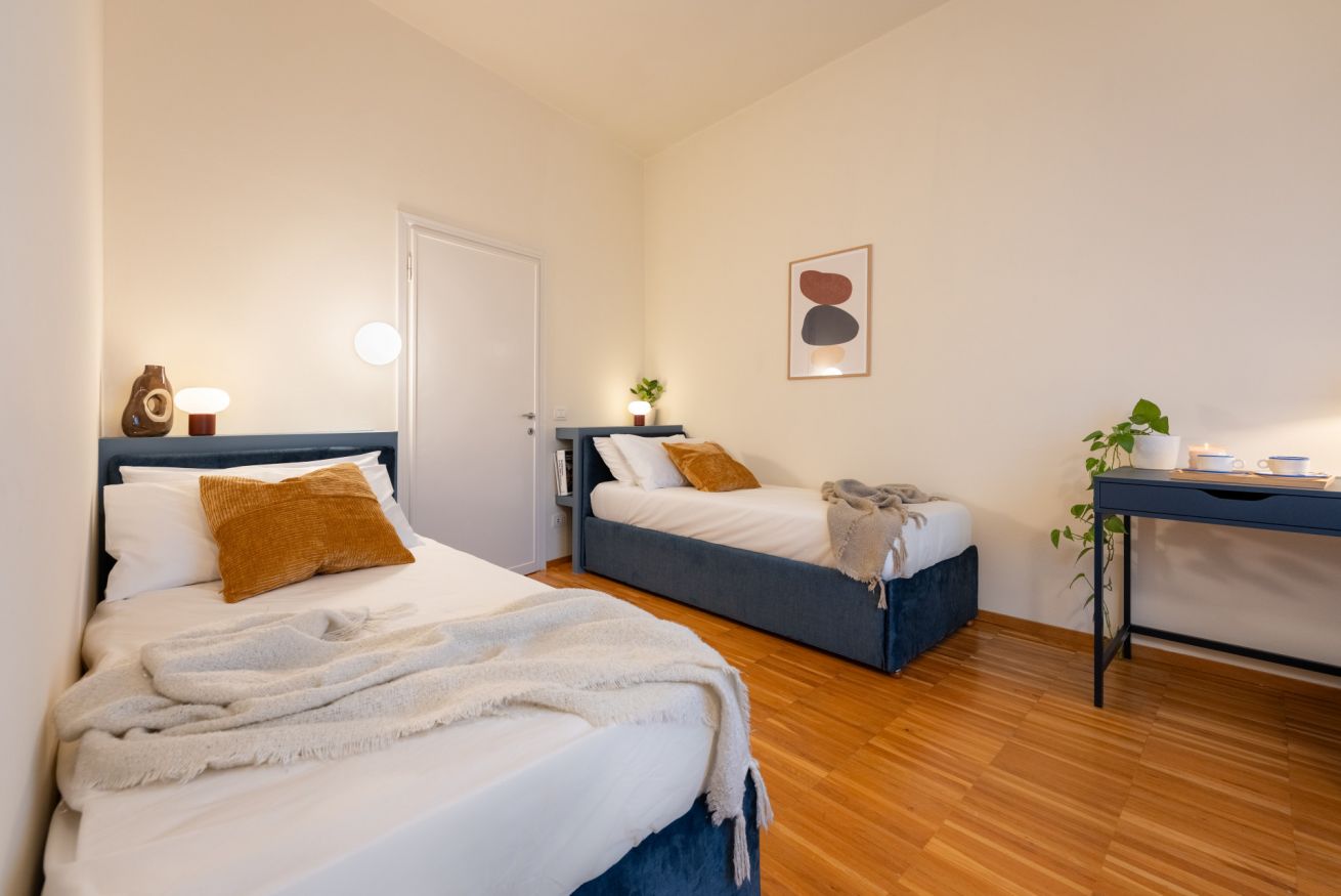 Successivamente si accede all'area notte composta da 3 camere, ognuna delle quali con bagno en-suite e cabina armadio. La prima è costituita da 2 letti singoli e bagno en-suite con vasca, mentre seguono le altre 2 matrimoniali, una con bagno con doccia e l'altra con vasca.