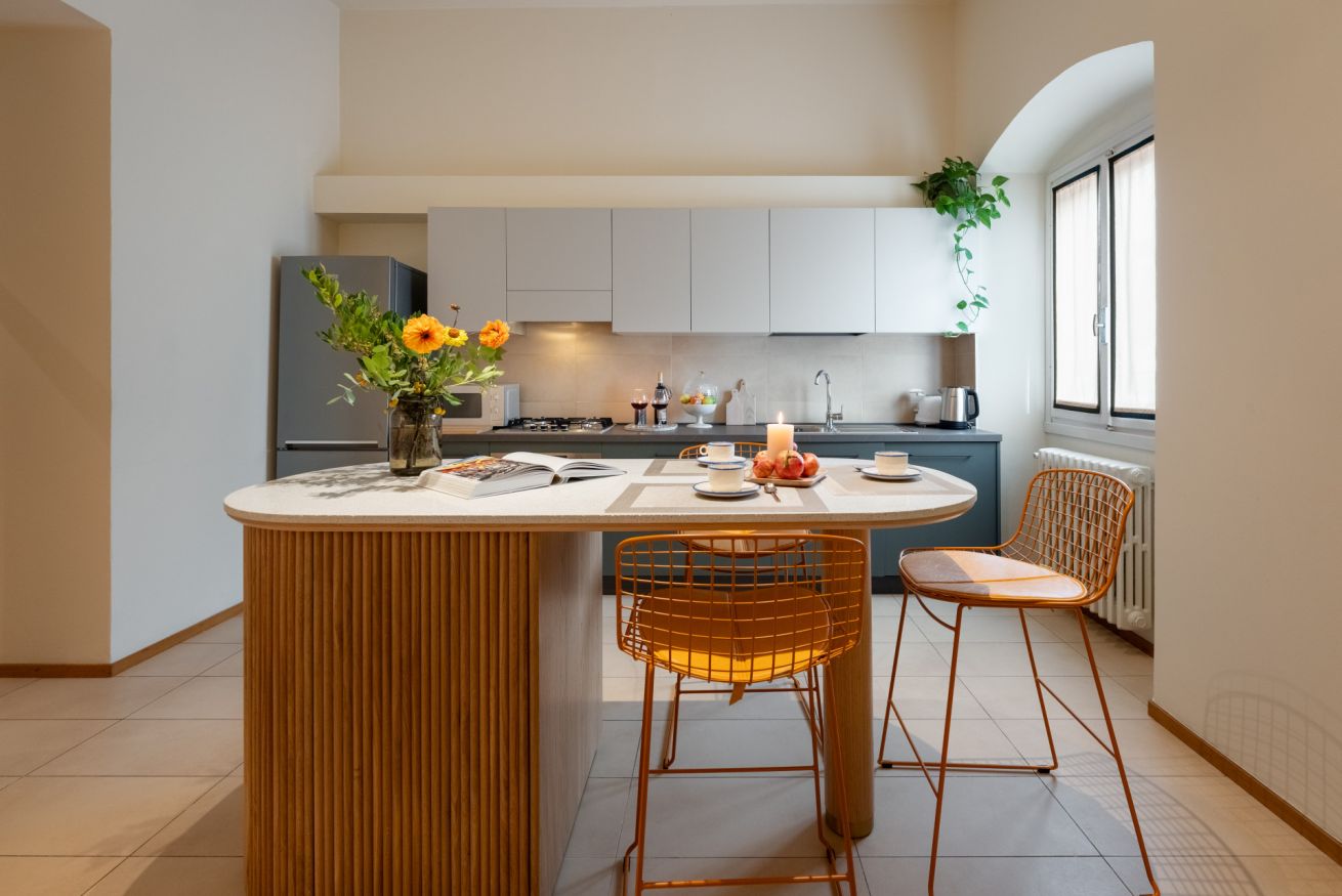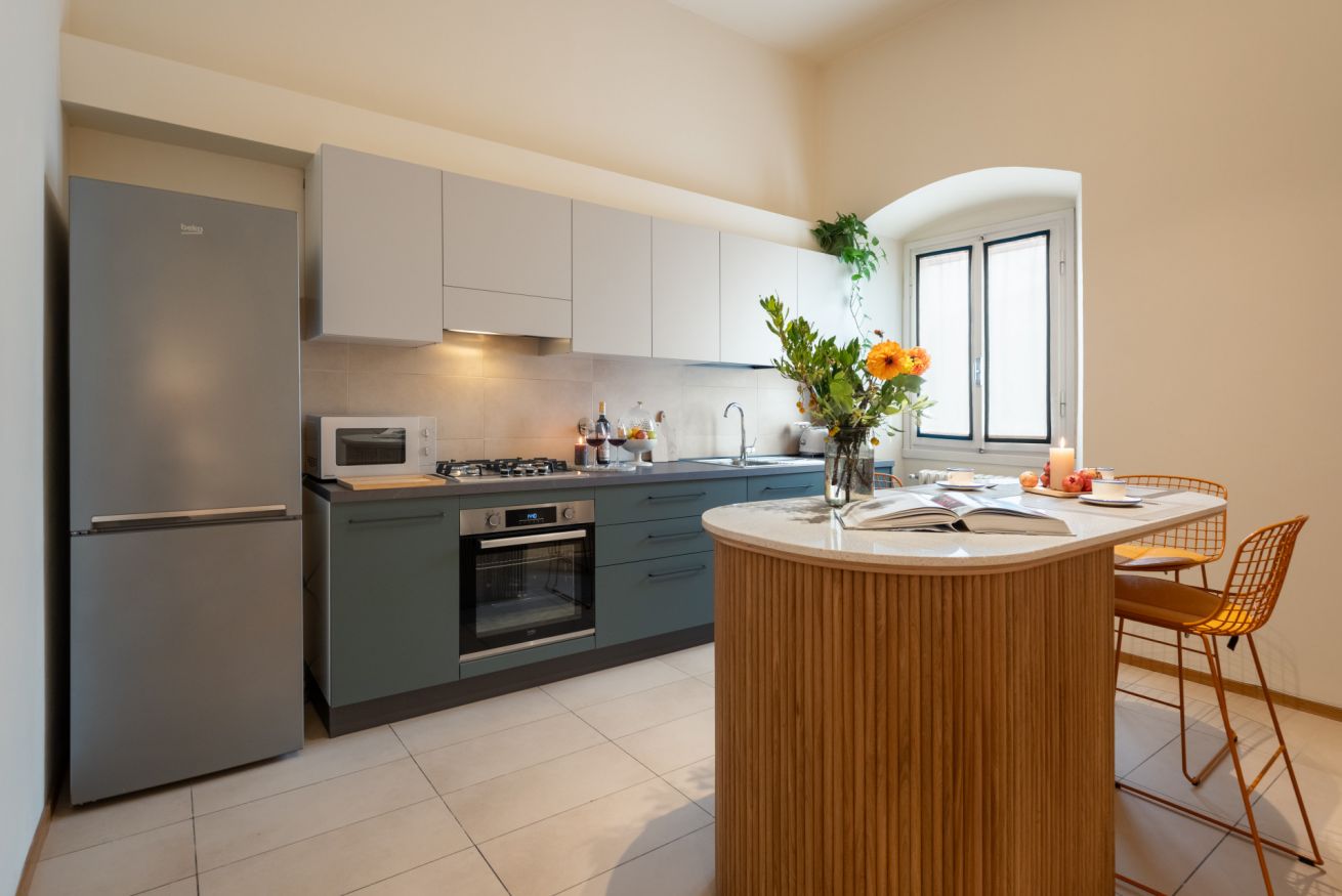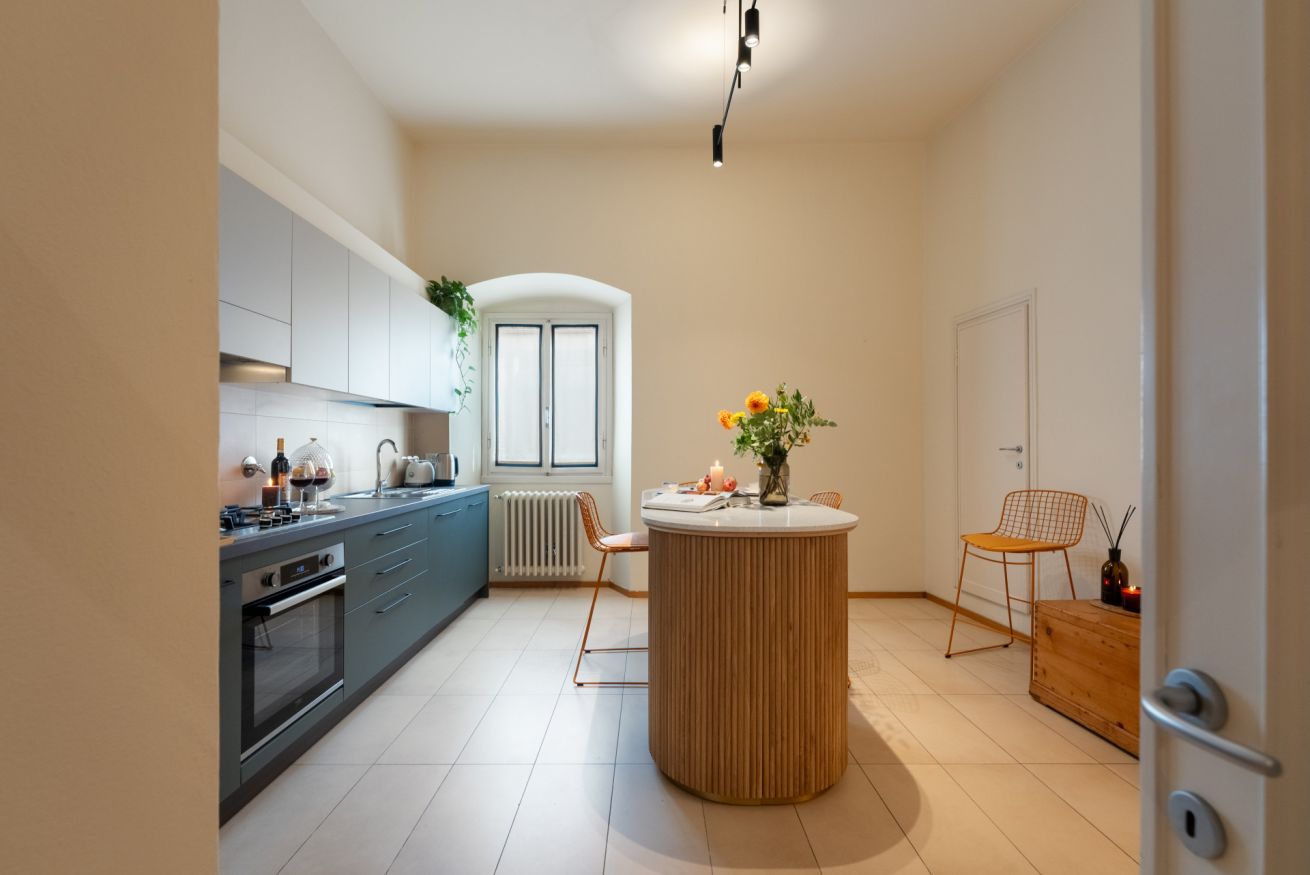 Attraverso la corte interna gìà parte esclusiva della proprietà, da un ingresso privato si raggiunge il 1° piano che accede direttamente all'appartamento. Casine Design Apartment si sviluppa su un unico livello , snodandosi lungo un corridoio che costituisce la spina dorsale della casa. Non appena entrati sulla destra si trova un pratico bagno di servizio. Proseguendo lungo il corridoio sulla destra, si incontra la cucina totalmente attrezzata con elettrodomestici di ultima generazione. In cucina si trova anche un pratico tavolo con 3 sedute, ideale per consumare pasti leggeri o spuntini. Attraverso una porta si accede inoltre ad una comoda stanza lavanderia perfettamente attrezzata.