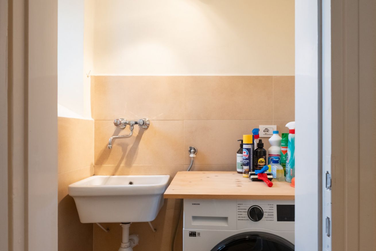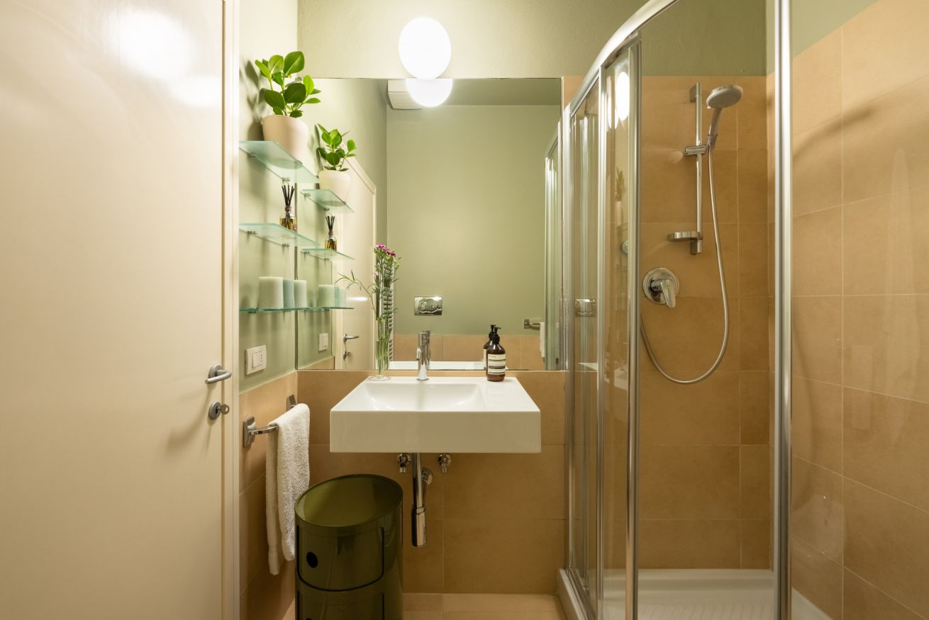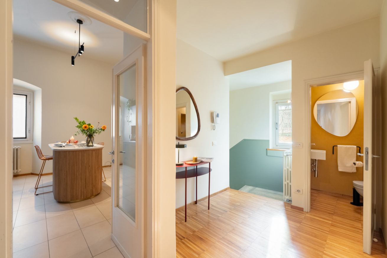 Attraverso la corte interna gìà parte esclusiva della proprietà, da un ingresso privato si raggiunge il 1° piano che accede direttamente all'appartamento. Casine Design Apartment si sviluppa su un unico livello , snodandosi lungo un corridoio che costituisce la spina dorsale della casa. Non appena entrati sulla destra si trova un pratico bagno di servizio. Proseguendo lungo il corridoio sulla destra, si incontra la cucina totalmente attrezzata con elettrodomestici di ultima generazione. In cucina si trova anche un pratico tavolo con 3 sedute, ideale per consumare pasti leggeri o spuntini. Attraverso una porta si accede inoltre ad una comoda stanza lavanderia perfettamente attrezzata.